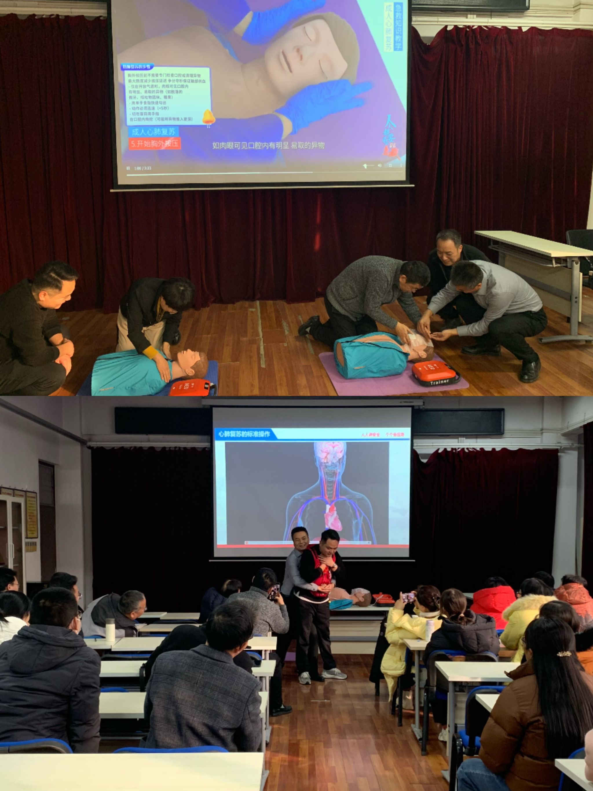 培训中,王乐乐聚焦校园应急救护核心需求,重点围绕心肺复苏操作流程、自动体外除颤器(AED)使用规范以及海姆立克急救法实操技巧三大模块展开。他结合真实应急案例,通过理论讲解、动作示范、要点拆解等方式,清晰阐释了各项急救技能的关键原理与操作细节,强调了“黄金急救时间”内规范施救的重要性,帮助教职工建立起科学的应急救护认知。
